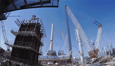▲中聯(lián)重科3200噸履帶吊正在吊裝凈重1308噸的反應器