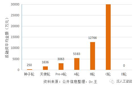 第四,從一級(jí)市場(chǎng)投資各輪的平均融資金額來看,機(jī)器人行業(yè)在天使輪與Pre-A輪等早期階段,所需的啟動(dòng)金額相對(duì)人工智能行業(yè)公司平均融資金額較高一點(diǎn)。到達(dá)A輪和B輪中期時(shí),投融資估值相對(duì)較低,也部分反映出盈利模式尚未成熟。