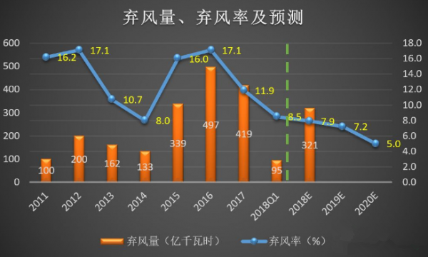 下圖為風電棄風率從2011年到2017年的變化情況以及2018年全年的棄風率、棄風量預測以及至2020年的棄風率預測。