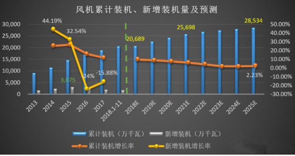 2016年11月29日,國家能源局印發(fā)《風電發(fā)展“十三五”規(guī)劃》,根據(jù)規(guī)劃提出總量目標,到2020年底,風電累計并網(wǎng)裝機容量確保達到2.1億千瓦以上,下圖為2013年至2018年1-11月各年新增裝機、累計裝機容量和各自增長率變化數(shù)據(jù),以及通過未來經(jīng)濟增長率、可再生能源總裝機、風電總裝機等推算預測出2018至2025年風電累計裝機容量以及其增長率。