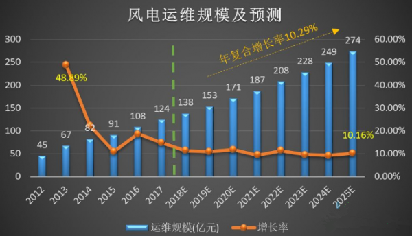 下圖為2012年至2017年風電運維市場規(guī)模、2018至2025年運維市場規(guī)模預測以及其年復合增長率。