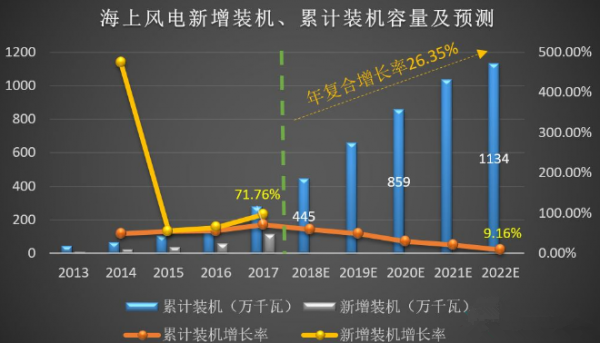 下圖為2013年至2017年新增裝機、累計裝機容量和各自增長率變化數(shù)據(jù),以及通過推算預測出2018至2022年風電累計裝機、累計裝機增長率以及其年復合增長率。