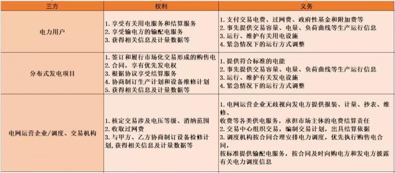 此外,三方協(xié)議及交易平臺同樣是分布式發(fā)電市場化交易中的要點。三方協(xié)議需購電方(電力用戶)、發(fā)電方(分布式發(fā)電項目)、輸電方(電網運營企業(yè))共同明確易模式、交易電量、交易期限,交易價格、計量、結算,以及三方權利與義務等內容。三方具體權利及義務如下表所示: