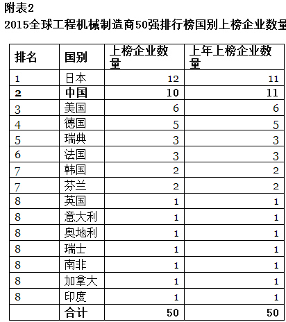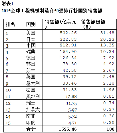 受全球經(jīng)濟復(fù)蘇緩慢,中國經(jīng)濟進入下行調(diào)整期等綜合影響,世界工程機械產(chǎn)業(yè)至今仍處下行區(qū)間,中國工程機械行業(yè)也出現(xiàn)較大幅度下滑。最新一屆“2015全球工程機械制造商50強排行榜”顯示,作為世界經(jīng)濟風向標的全球50家工程機械制造商,2014年銷售額為1595.46億美元,同比下滑10.68%。中國上榜的10家企業(yè),銷售額212.91億美元,同比下降24.52%。以國別銷售額統(tǒng)計,中國僅次于美國、日本,排名第三。瑞典、德國、韓國分列第四、五、六位。(詳見附表1、附表2)。