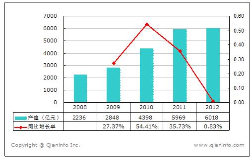 2008-2012年建筑機(jī)械行業(yè)整體呈上升趨勢,其年復(fù)增長率達(dá)到28%,特別是2010和2011年其產(chǎn)值增長速度較快。2012年,受國內(nèi)建筑業(yè)和房地產(chǎn)也的影響,建筑機(jī)械市場發(fā)展緩慢。全國建筑機(jī)械行業(yè)完成工業(yè)總產(chǎn)值6018.34億元,累計同比增長為0.83%。
